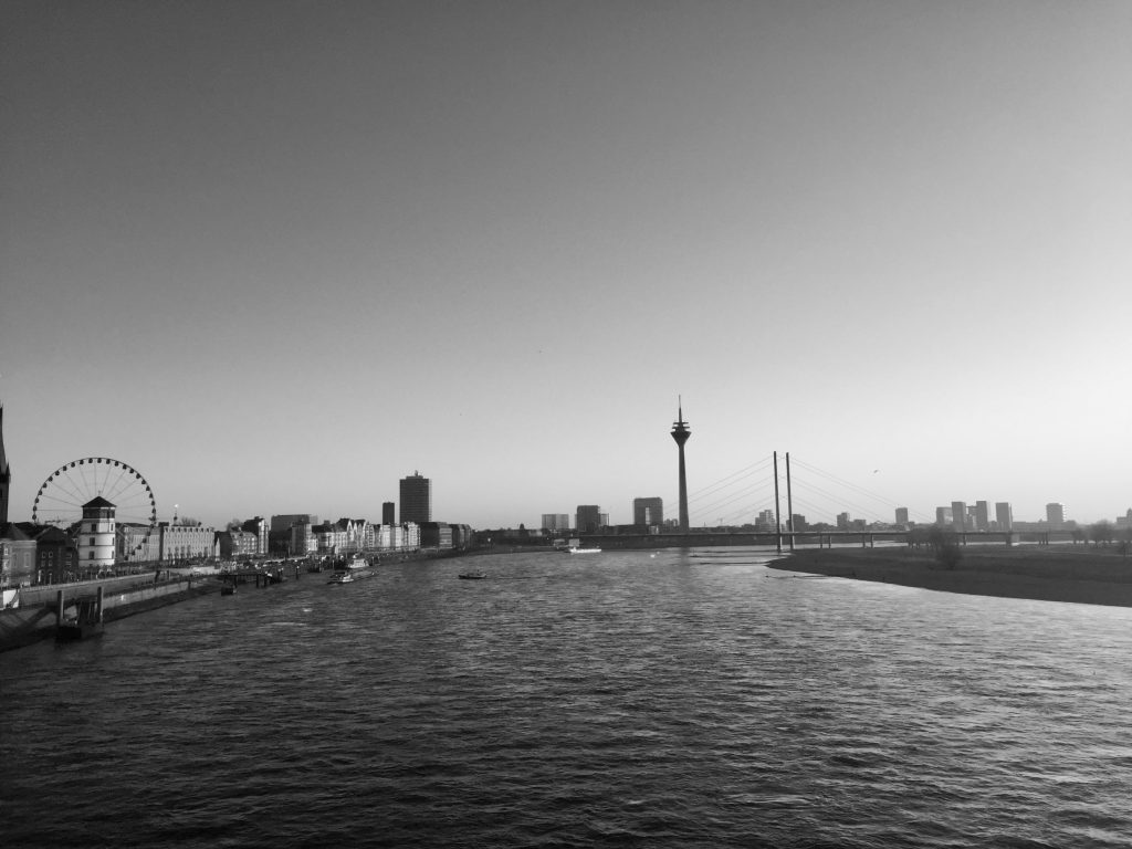 Düsseldorf, view to the city from Oberkasseler Brücke on a clear day